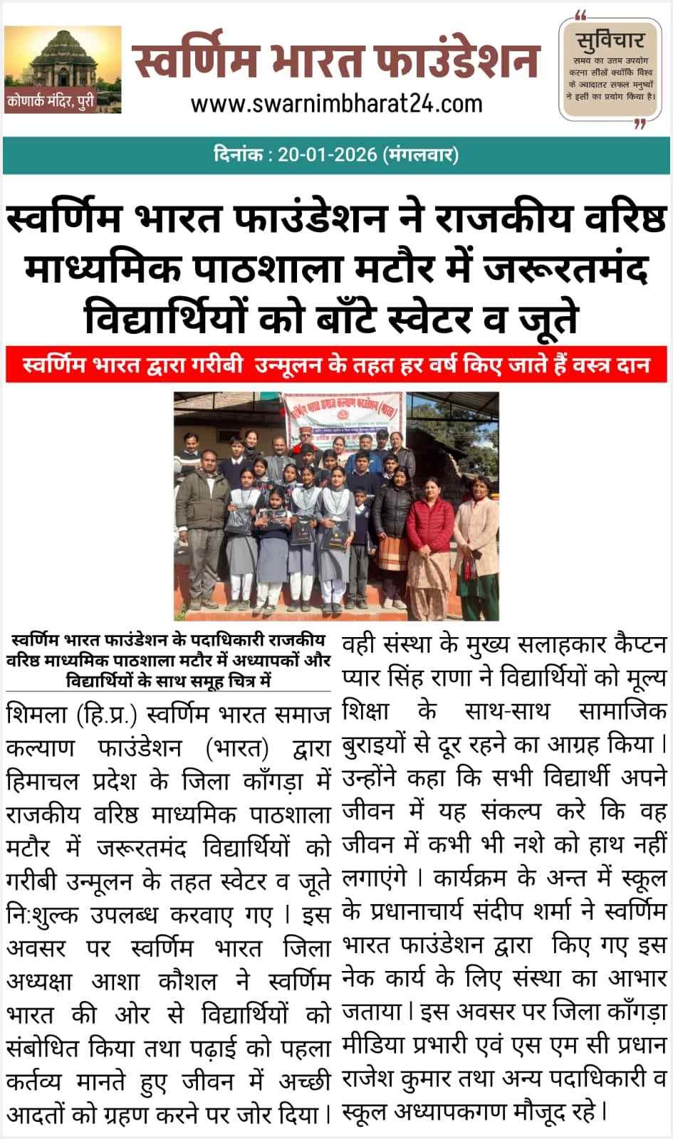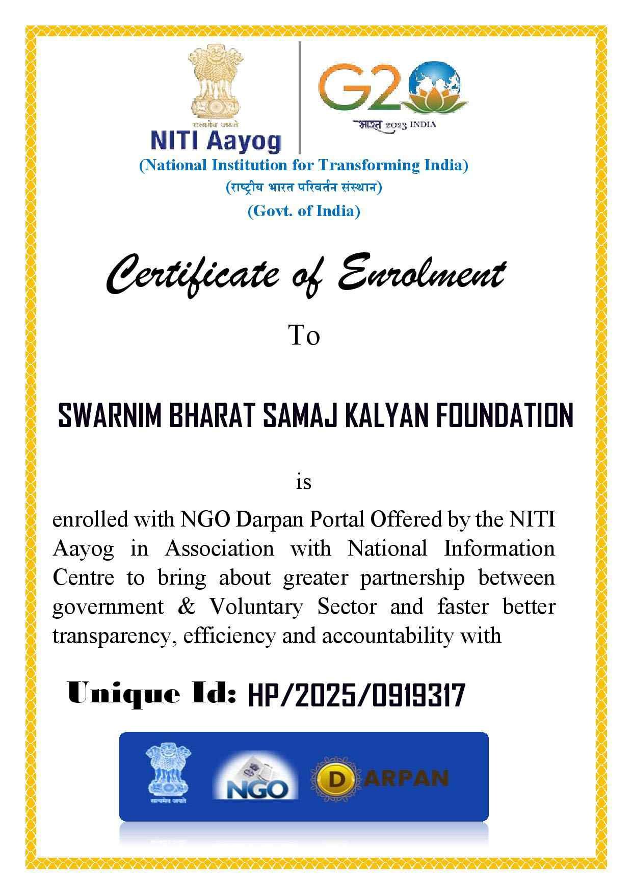 The name Swarnim Bharat Samaj Kalyan Foundation reflects a powerful vision - “Swarnim Bharat” symbolizes a Golden India built on strong moral values, unity, compassion, and inclusive progress. “Samaj Kalyan” represents our unwavering commitment to social welfare and humanitarian service.