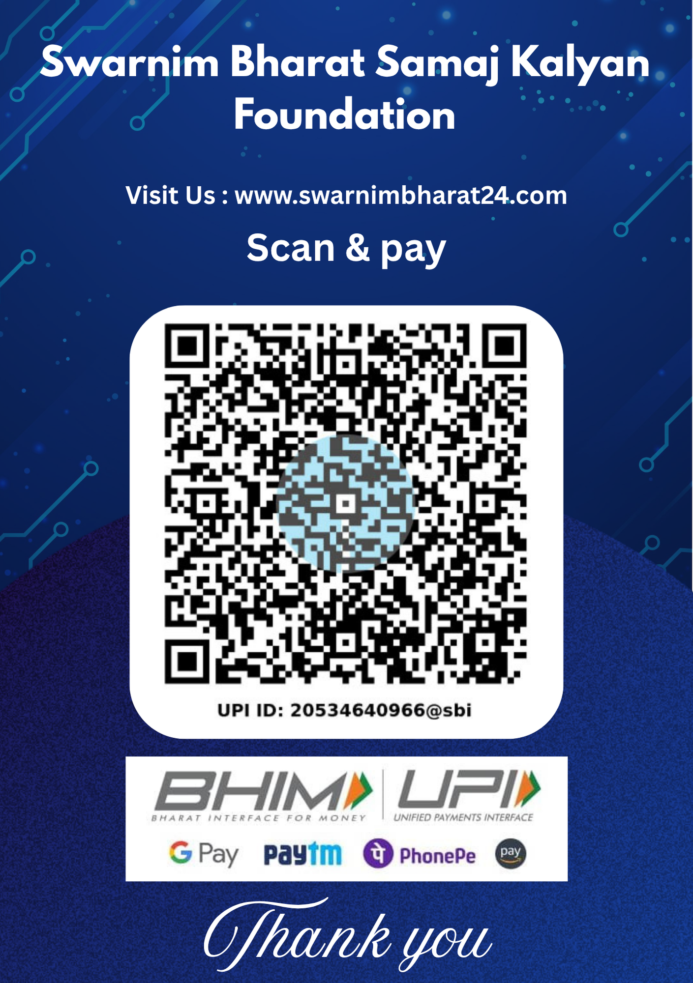 A/c Holder : Swarnim Bharat Samaj Kalyan Foundation