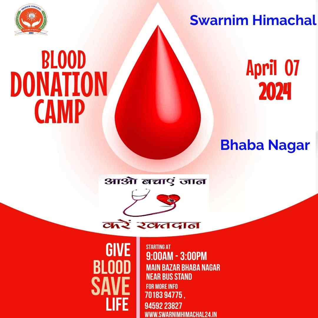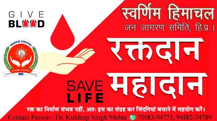 14 जून को विश्व रक्तदान दिवस के रूप में मनाया जाता है जिसके चलते स्वर्णिम हिमाचल द्वारा जून 2023 को रक्तदान महादान के रूप में मनाया जाएगा l जिसके तहत सभी समाजसेवियों से आग्रह है कि आप जनहित में अवश्य अपना रक्तदान कर जरूरतमंद रोगियों को प्राण दान देने में अपना सहयोग अवश्य करें l अत: आप सभी से आग्रह है कि आप अपने नजदीकी ब्लड बैंक में जाकर रक्तदान करते हुए अपना फोटो अवश्य लें तथा स्वर्णिम हिमाचल को प्रेषित करना सुनिश्चित करें ताकि स्वर्णिम हिमाचल आपको उचित सम्मान प्रदान कर सकें l